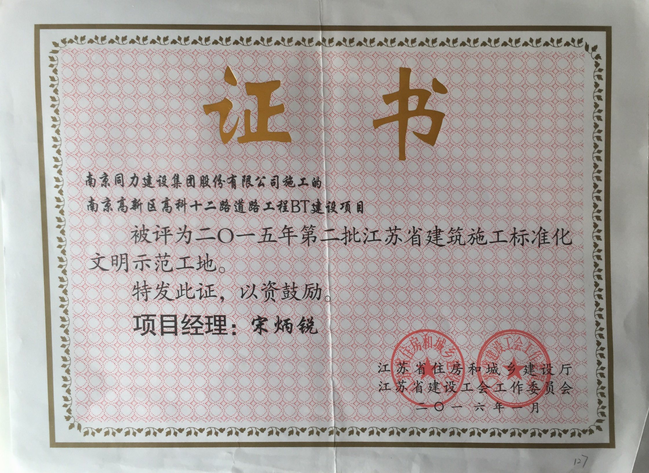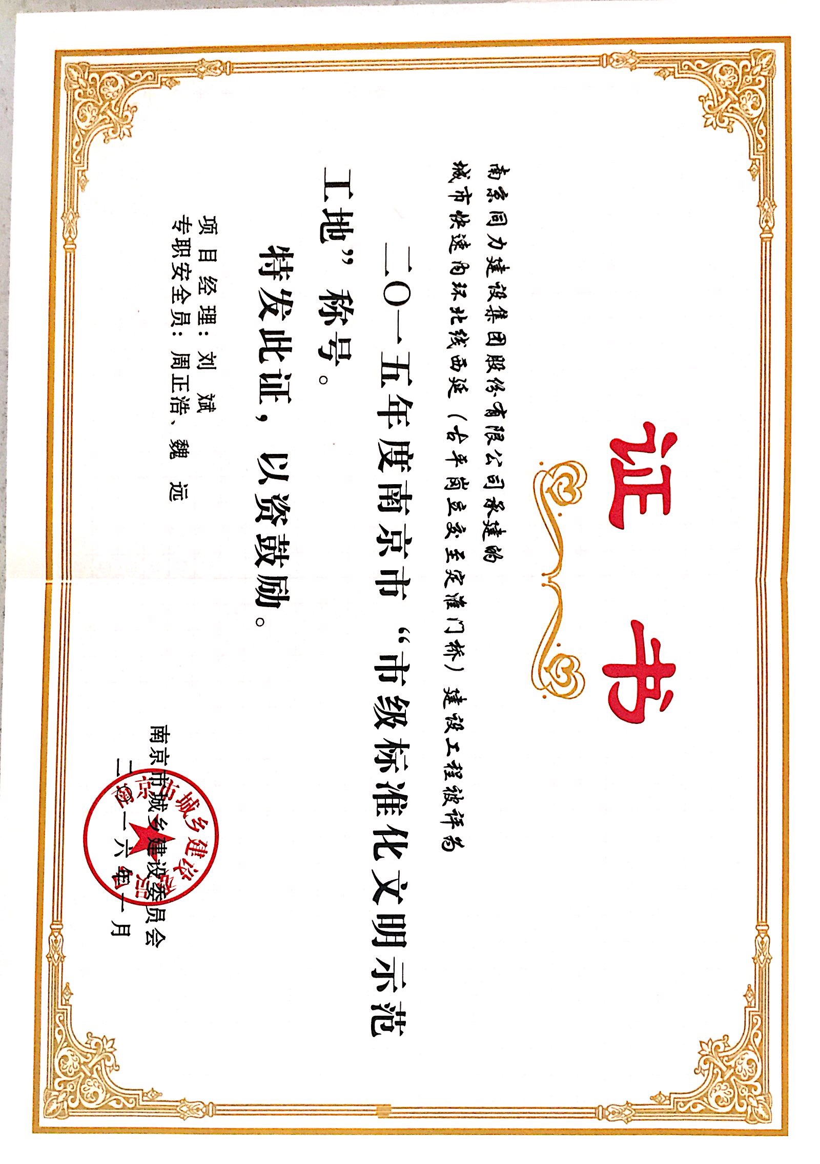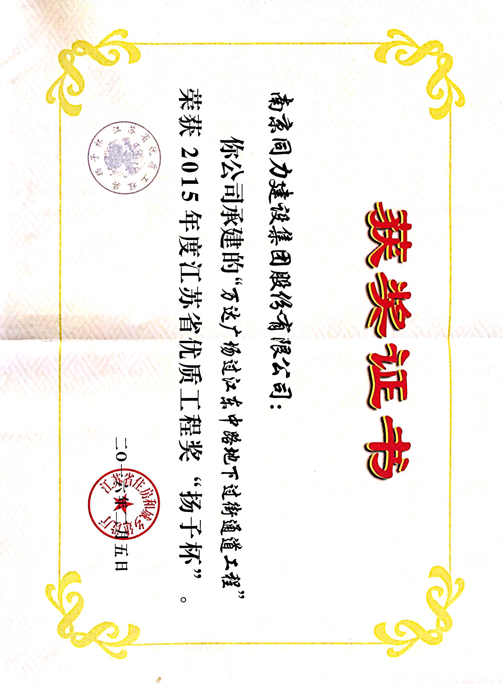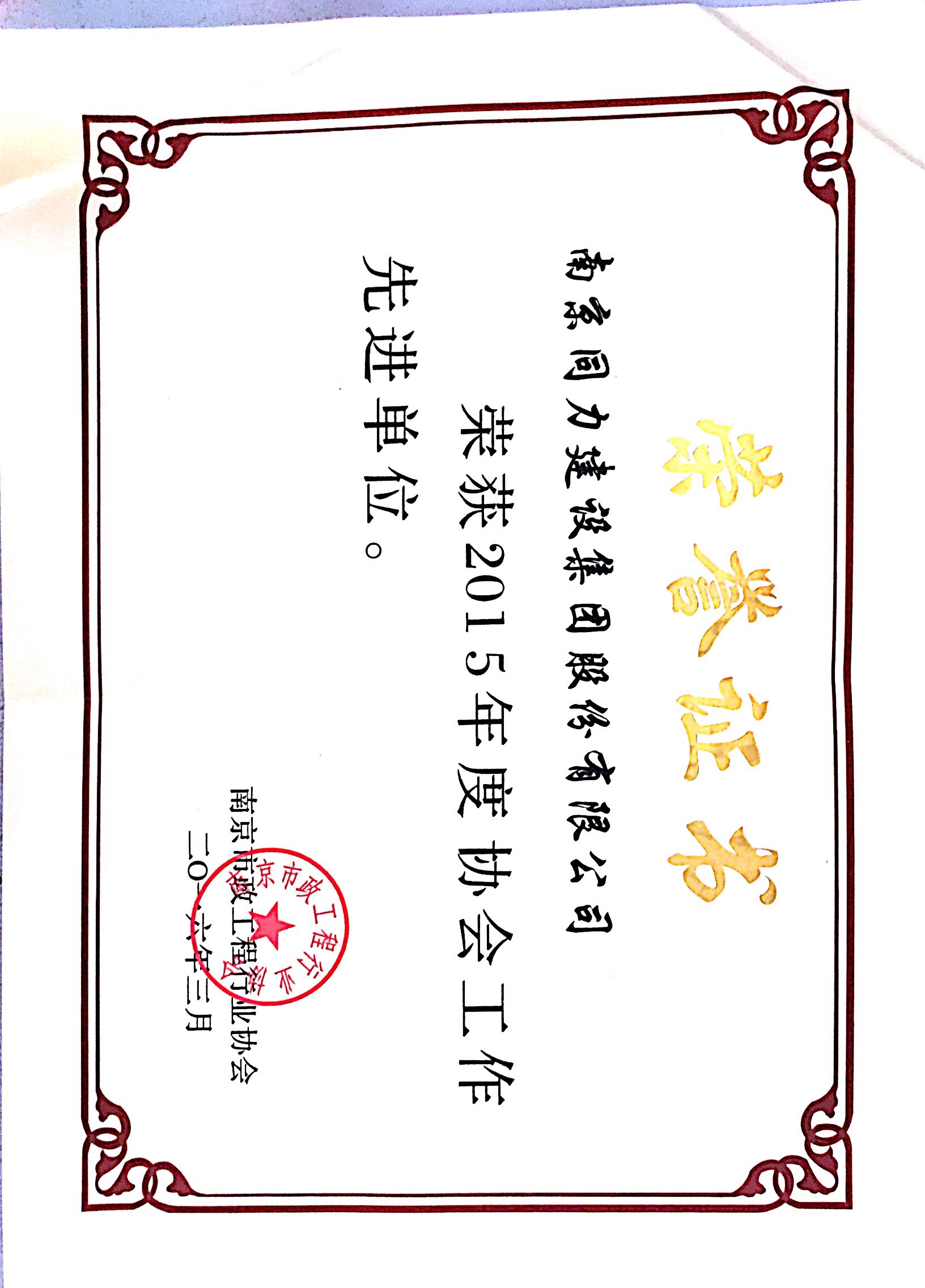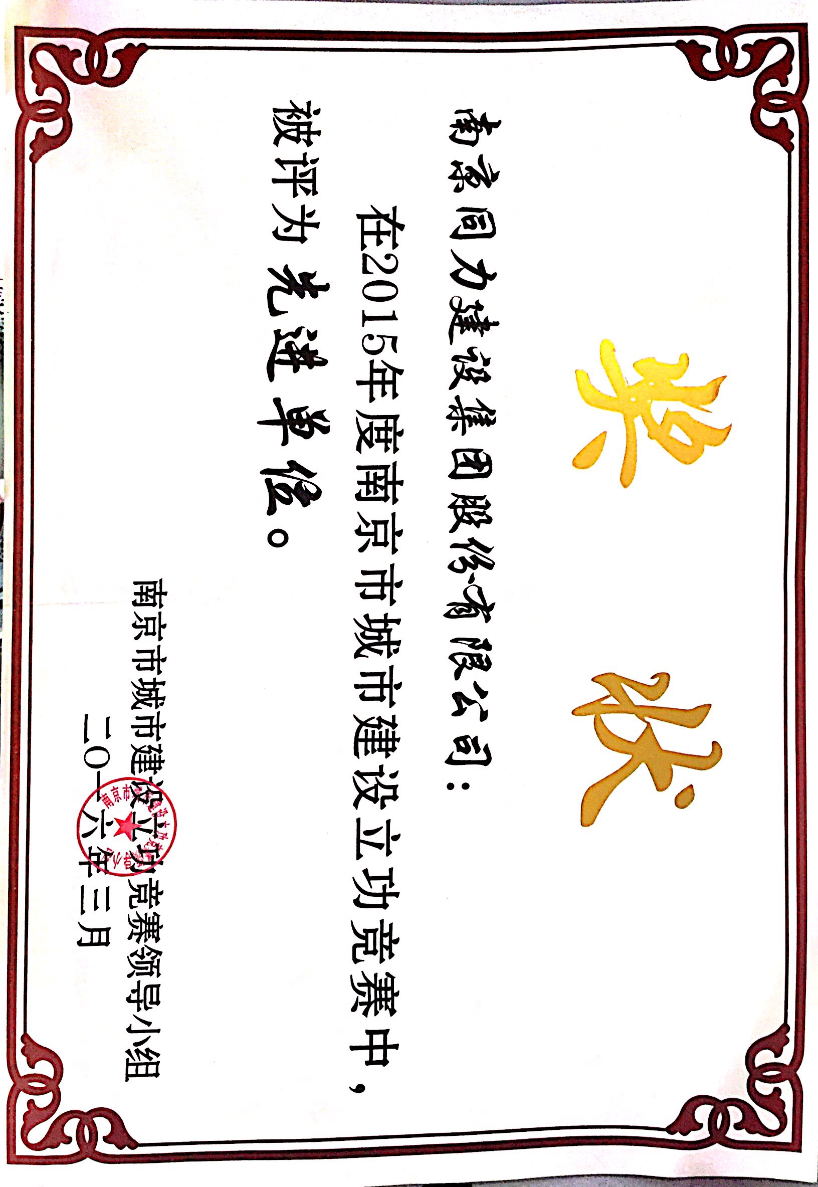 公司被評為“2015年度南京市城市建設立...