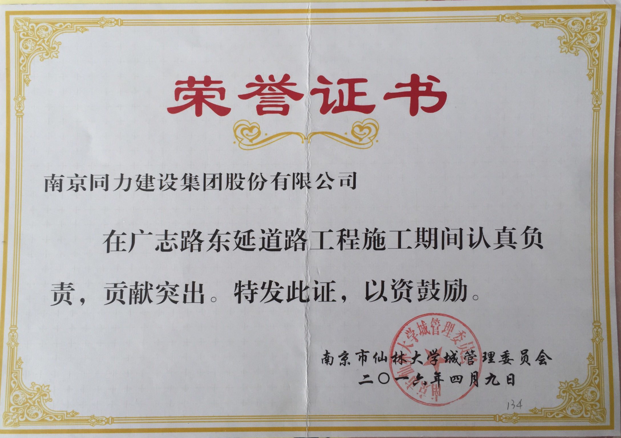 公司受到“廣志路東延道路工程表彰”