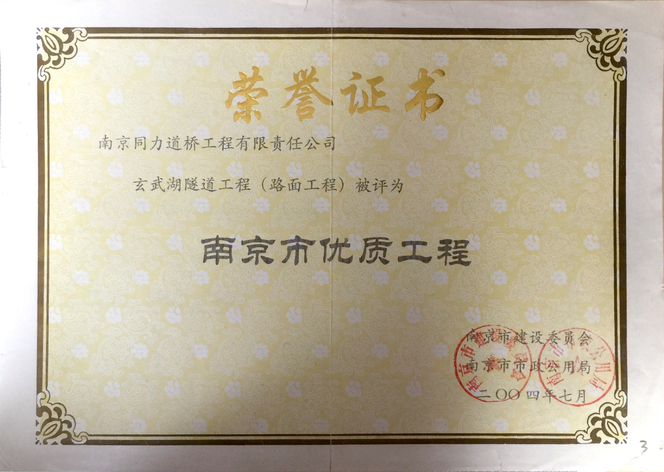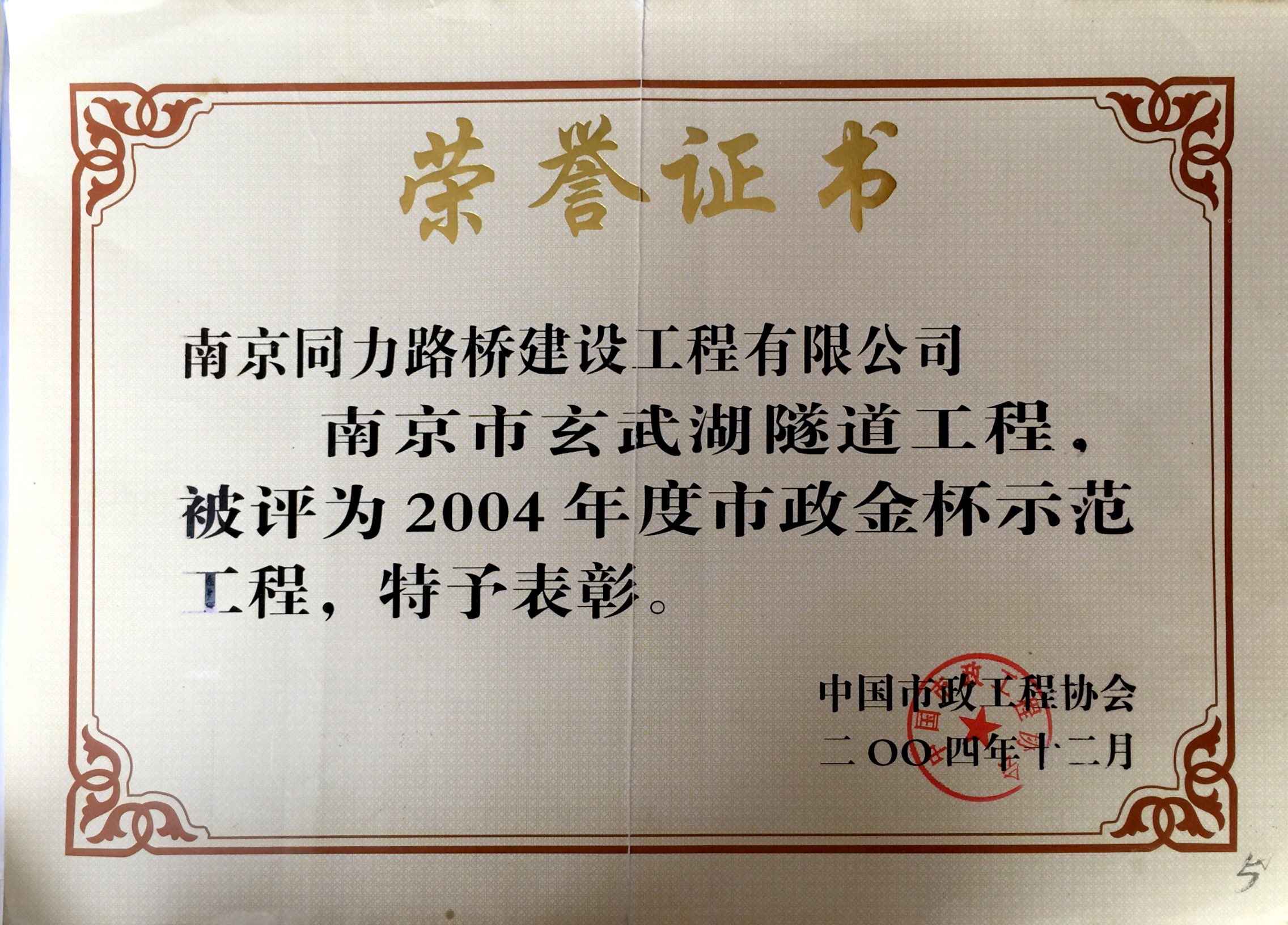 玄武湖隧道工程被評為“2004年度市政金...